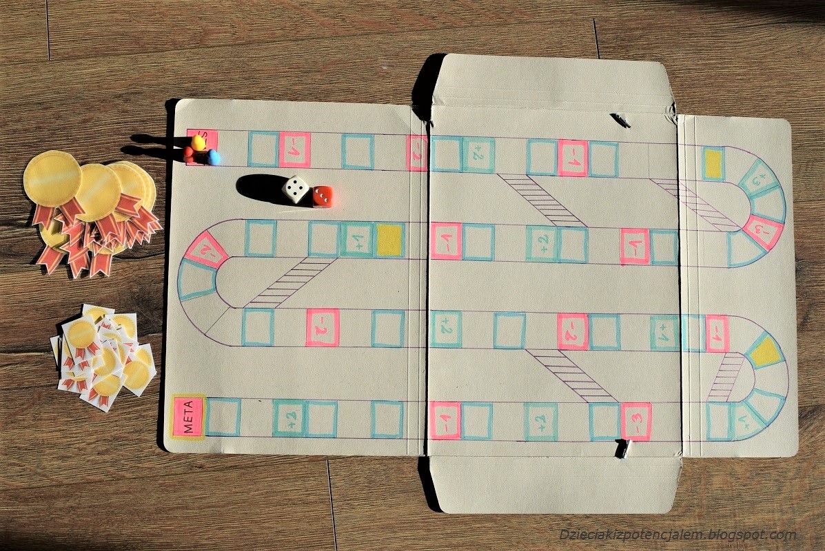 W skład gry wchodzą: plansza zrobiona z tekturowej teczki (o jej zaletach pisałam w artykule Kalambury), pionki, dwie kostki i żetony, które zbieramy w trakcie wyścigu. Moje żetony to zalaminowane obrazki przedstawiające medale, ale Wy możecie użyć czegokolwiek np. monet o wartości 1 grosz i 5 groszy, plastikowych nakrętek czy zapałek.