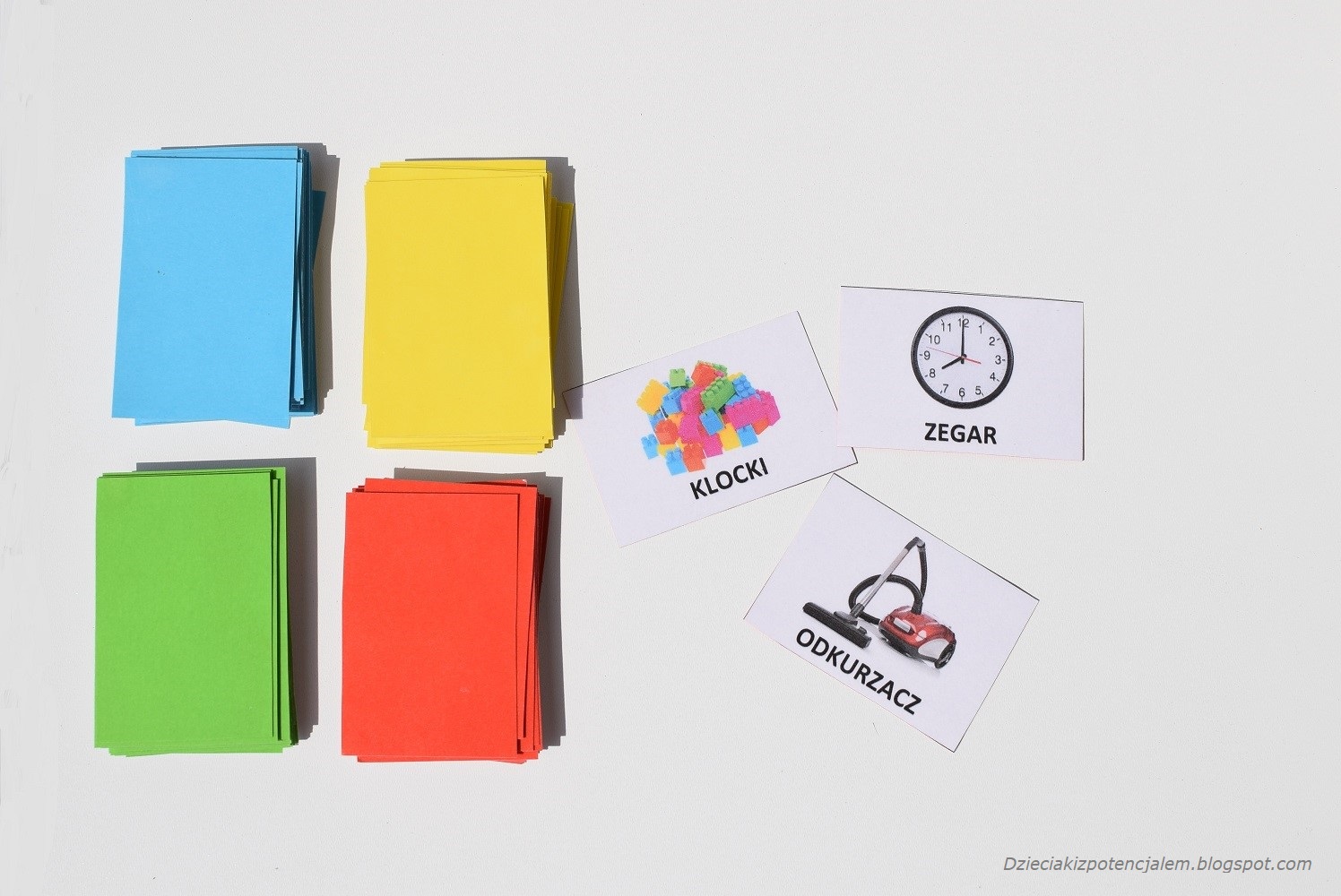 Karty to wydrukowane obrazki, podklejone kolorowym papierem i zalaminowane. Niestraszne im częste rozgrywki i zapowiada się, że są w stanie przetrwać lata w dobrym stanie. Obrazki są dodatkowo podpisane, w razie gdyby ktoś miał wątpliwości co przedstawiają, a przy okazji dzieci mogą ćwiczyć globalne czytanie.