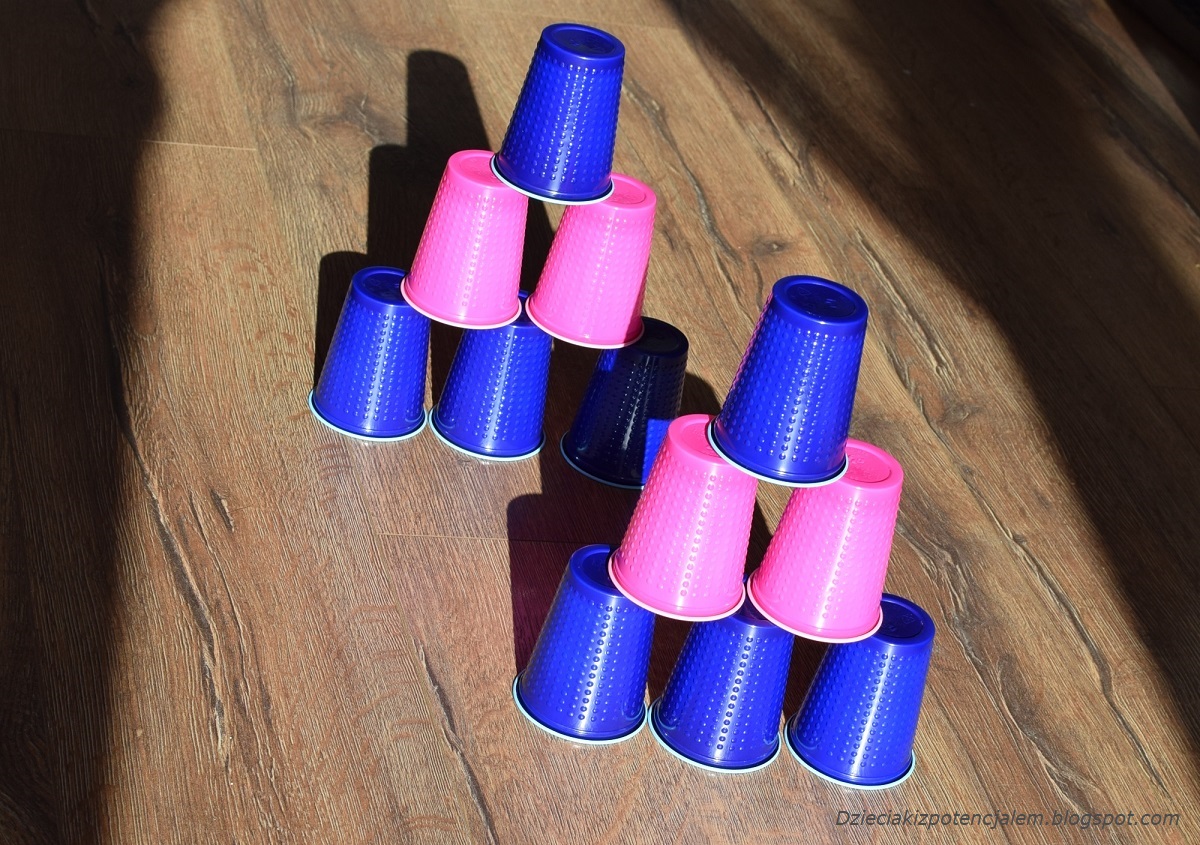 - Możemy tworzyć budowle z kubeczków i prosić dzieci żeby zbudowały taką samą konstrukcję. Jest to łatwiejsza wersja od tej z budowaniem według wzoru z karty.