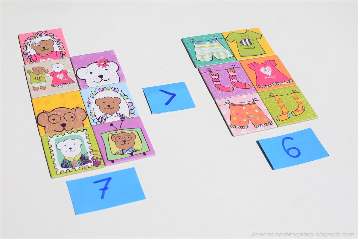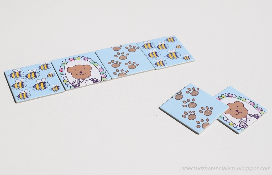 Ale… jak wiecie ja wykorzystuję wszystkie nasze gry na wiele sposobów, pisałam o tym np. tutaj Qwirkle jak wykorzystać do gier i zabaw z młodszymi dziećmi. Podobnie jest z memo. Egzemplarz, po który sięgamy najczęściej to Świat Misia od Granna. Spójrzcie jak można je wykorzystać w zabawie.