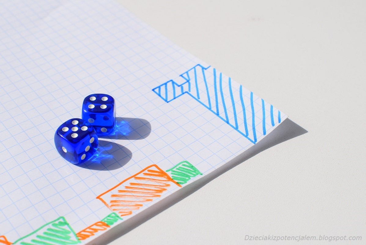 Idealnie do tego nada się prosta gra z kostkami, do której będziemy potrzebować kartkę A4 w kratkę, dwa różnokolorowe pisaki i cztery kostki (w zasadzie dwie tez wystarczą).