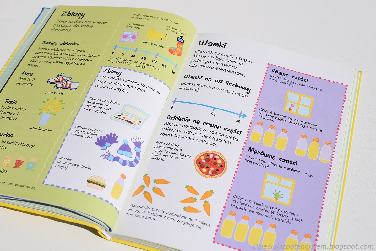 Słownik matematyczny jest pięknie ilustrowany, a pojęcia są w większości przedstawione w postaci kolorowych grafów, rysunków i tabelek, tak aby zachęcić dzieci do lektury i poznawania matematyki. Dodatkową zaletą kolorowych ilustracji jest to, że ułatwiają dzieciom zrozumienie zasad i zapamiętanie wiadomości. Zobaczcie sami.