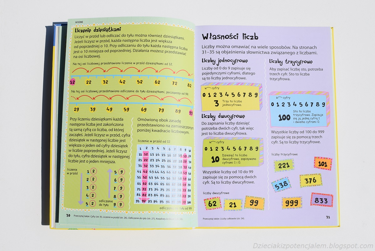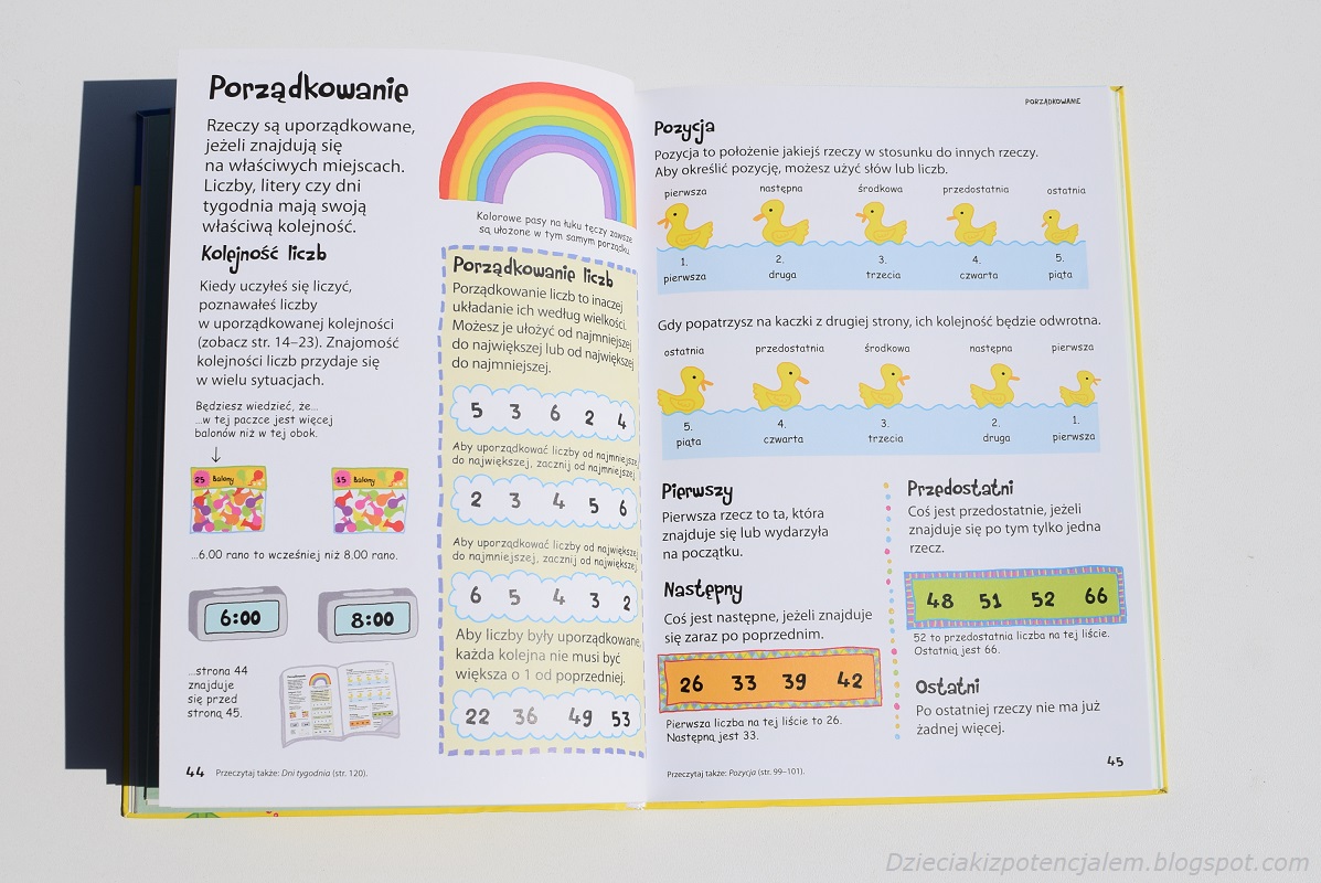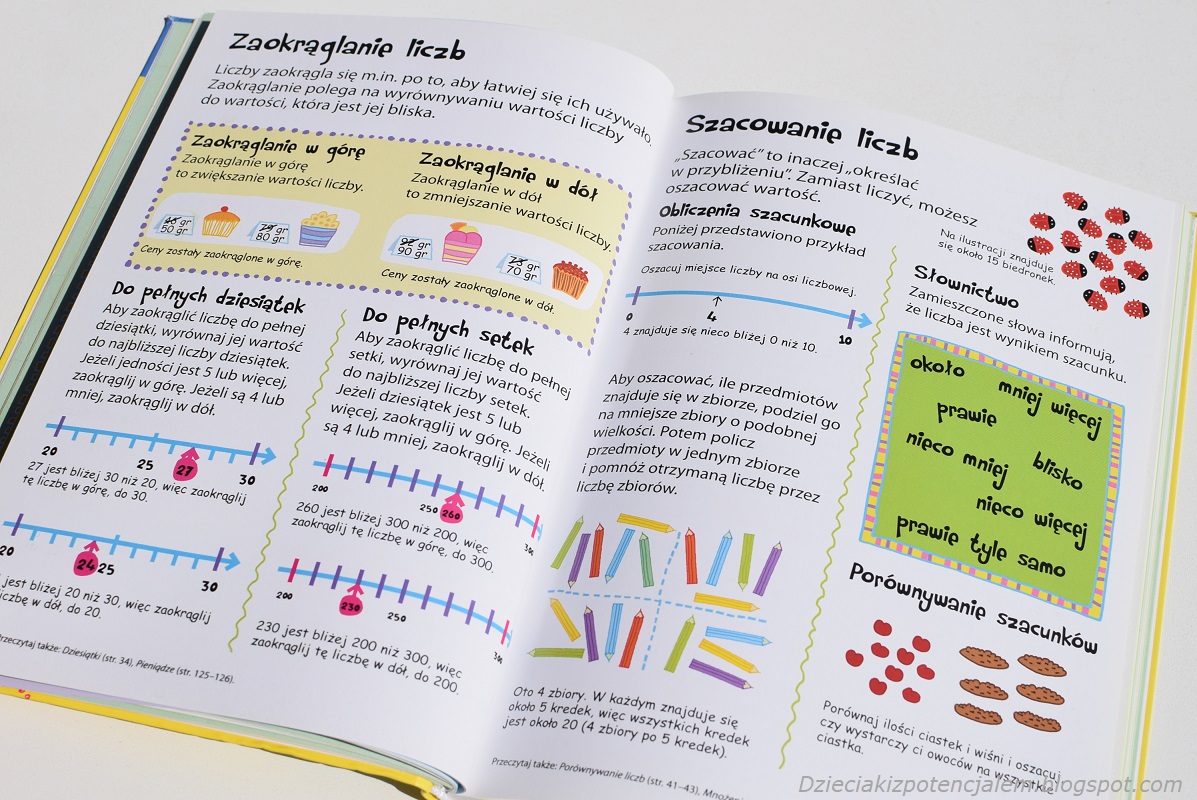 Poznamy z nich pojęcie czasu, dni tygodnia, kierunki i położenie, miary. Dowiemy się co to zaokrąglanie, szacowanie, zbiory, ułamki, figury płaskie i przestrzenne oraz wiele, wiele innych. Każdy mały czytelnik z pewnością znajdzie w niej coś da siebie.