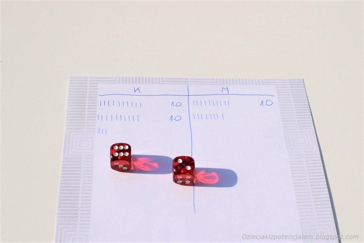 Dla urozmaicenia wyniki możemy zapisywać w postaci kresek (po pięć lub dziesięć). Przy okazji poćwiczymy liczenie piątkami / dziesiątkami.