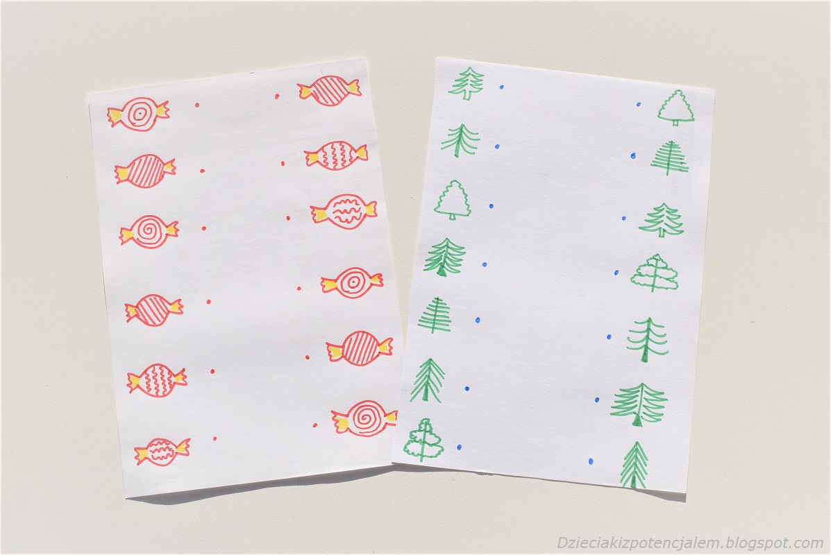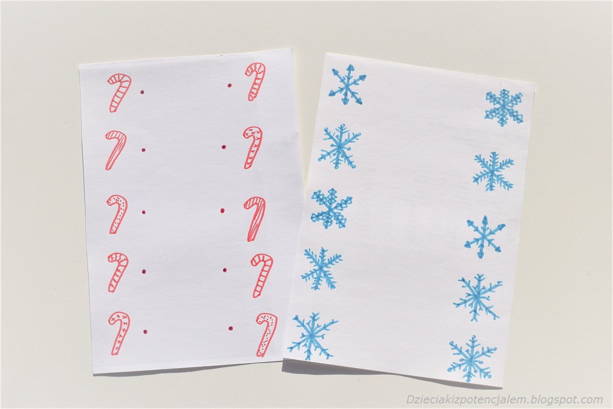 Dalej mamy łączenie w pary takich samych elementów: cukrowych laseczek, płatków śniegu, choinek oraz cukierków. To zadanie do najtrudniejszych nie należy ale sprawia dzieciakom dużą frajdę.