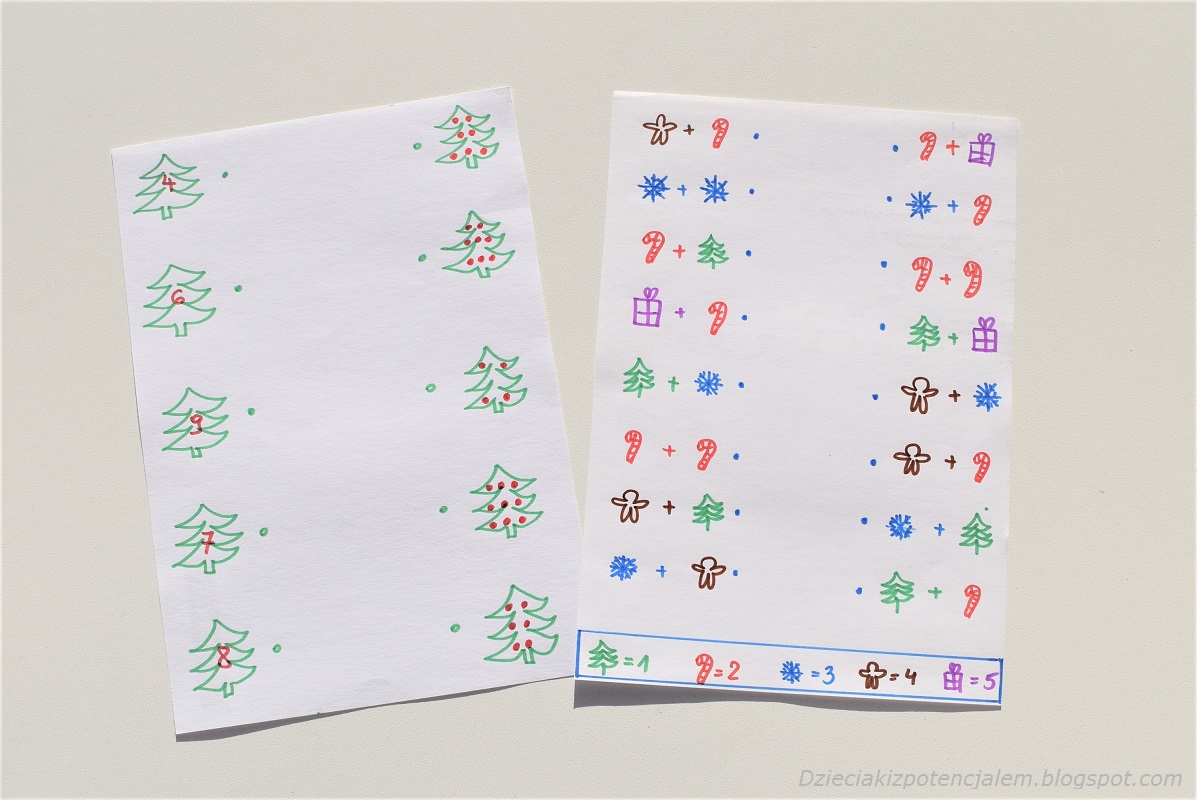 Kolejne karty to znów łączenie w pary. W jednym przypadku musimy połączyć liczbę z odpowiadającą jej ilością bombek na choince.