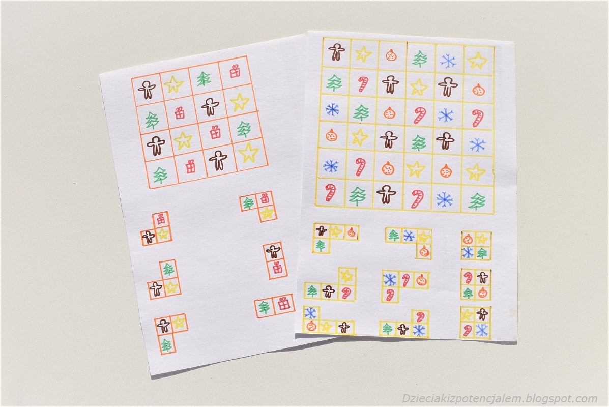 Na pierwszy ogień idą karty, z tabelkami wypełnionymi płatkami śniegu o różnych kształtach oraz kolorowymi bombkami. Ich rozmieszczenie nie jest jednak przypadkowe.  Zaczynając od lewego, górnego rogu należy poprowadzić linię do prawego dolnego roku po wytyczonej trasie. Trasę tą wyznaczają trzy płatki śniegu/bombki ułożone w konkretnej kolejności. Podążając za właściwą sekwencją, dotrzemy do celu. Przemieszczamy się w dowolnym kierunku w pionie lub poziomie.