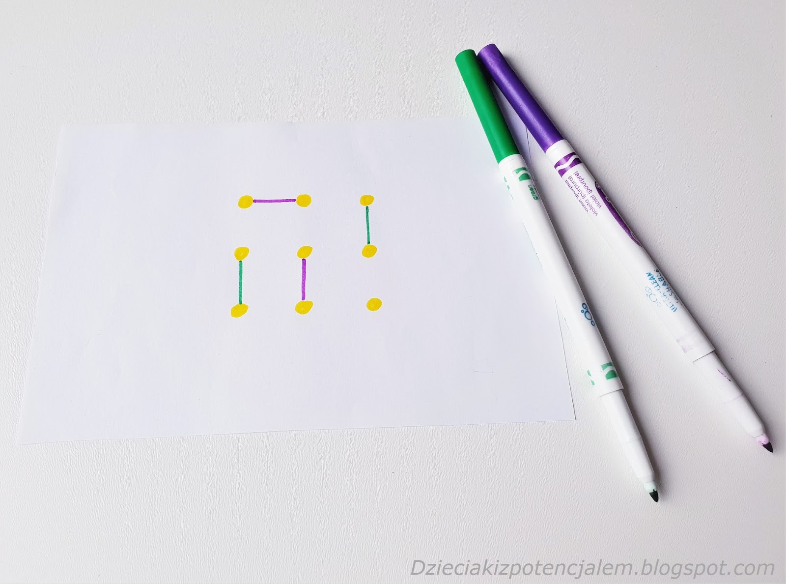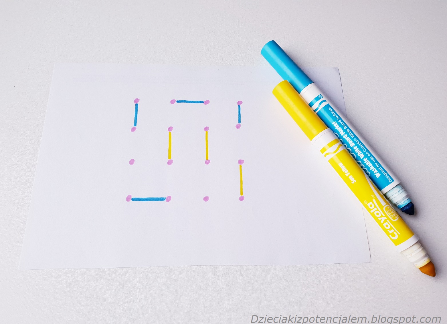 Najprostsza wersja zakłada siatkę kropek o wymiarach 3×3. Możemy sobie taki papier wydrukować lub narysować kropki na papierze w kratkę na przecięciach linii. Plansza może przybrać rozmiar 4×4 lub 5×5. Większe według mnie nie mają sensu, ponieważ połowę gry zajęłoby swobodne rysowanie odcinków, a strategia i planowanie ruchów pojawiają się dopiero pod koniec.