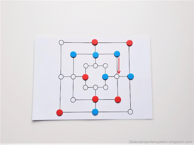 Poniżej gracz niebieski może zrezygnować z dołożenia nowego pionka na planszę a zamiast tego przesunąć pionek znajdujący się już na planszy, wewnątrz małego kwadratu i tym samym stworzyć młynek.
