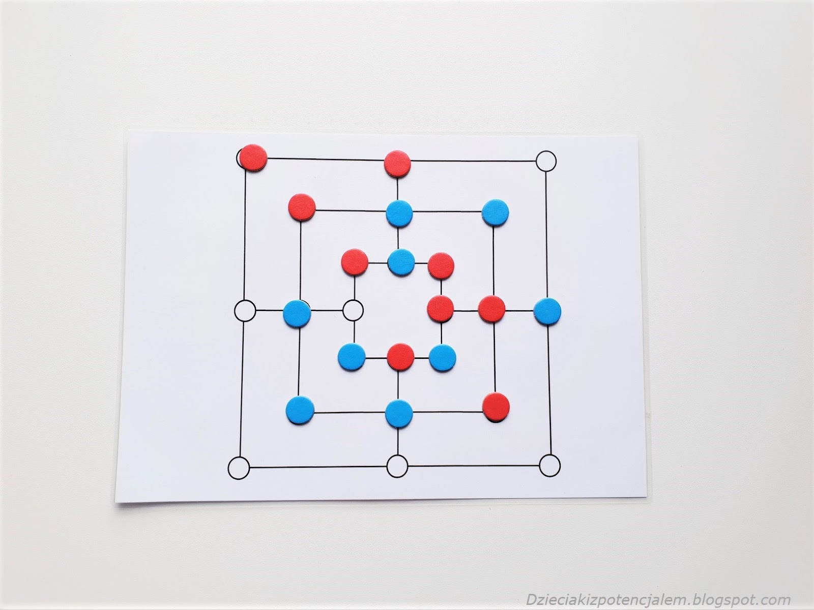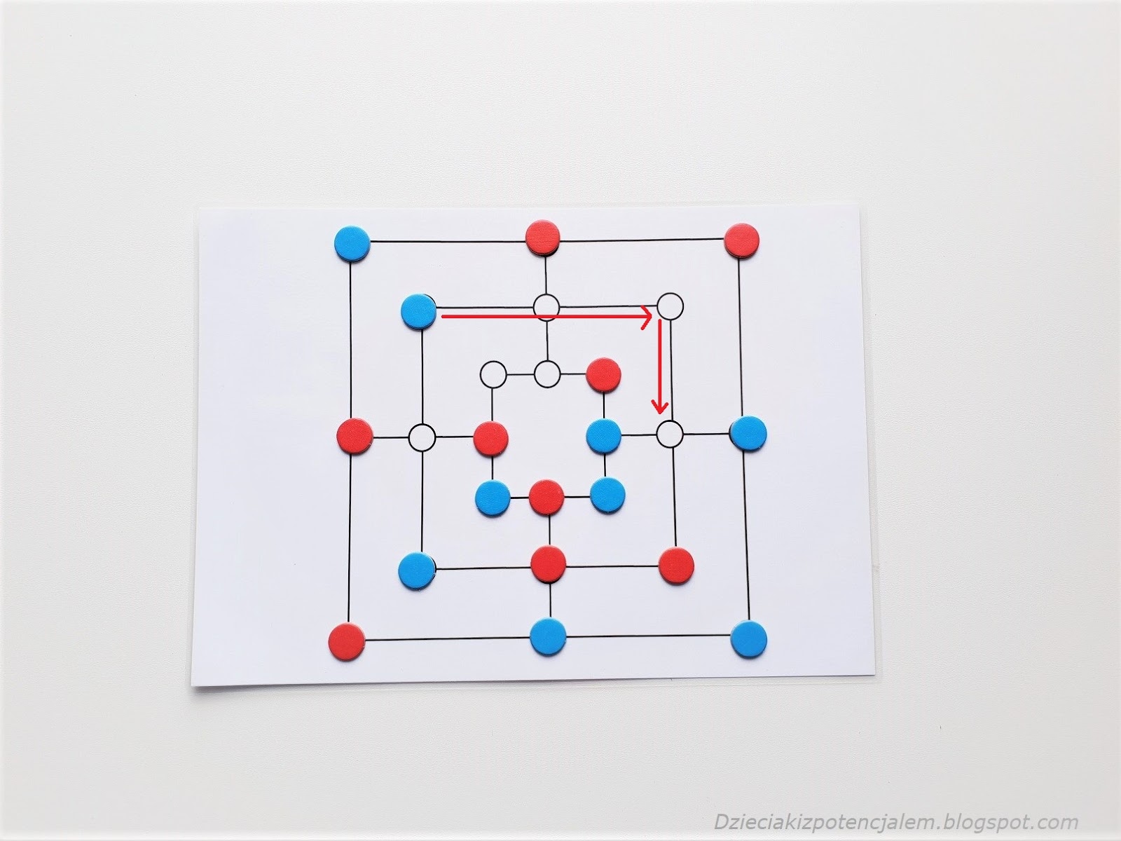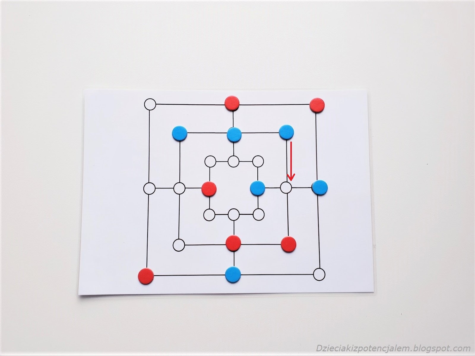 Poniżej gracz niebieski może zrezygnować z dołożenia nowego pionka na planszę a zamiast tego przesunąć pionek znajdujący się już na planszy, wewnątrz małego kwadratu i tym samym stworzyć młynek.