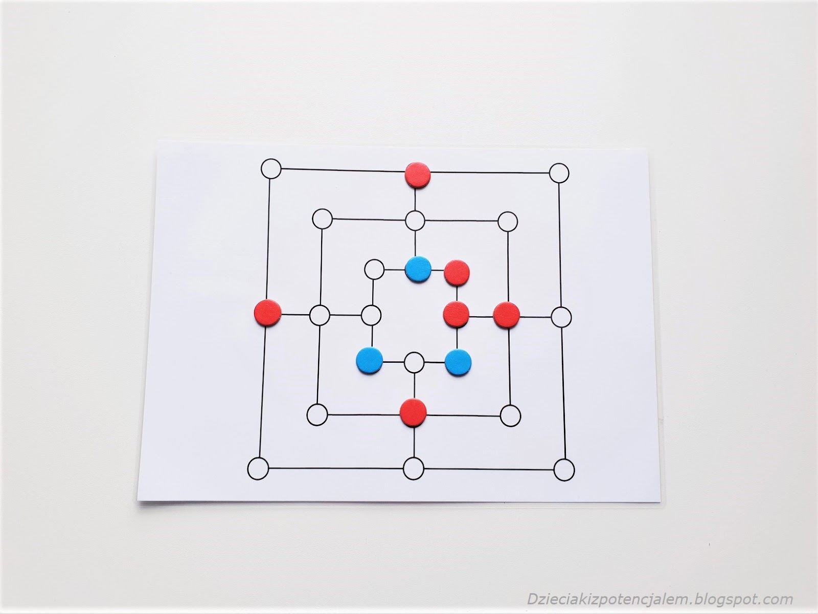 Znacie grę młynek? Teraz już chyba niewiele osób w niego gra, ale w czasach mojego dzieciństwa większość plansz do popularnych wtedy warcabów (pisałam o nich ostatnio Wracaby), miała na odwrocie planszę do gry w młynek. Mam sentyment do tych gier sprzed lat i dlatego postanowiłam ją sobie zrobić na odwrocie planszy do warcabów, na wzór starych gier 🙂