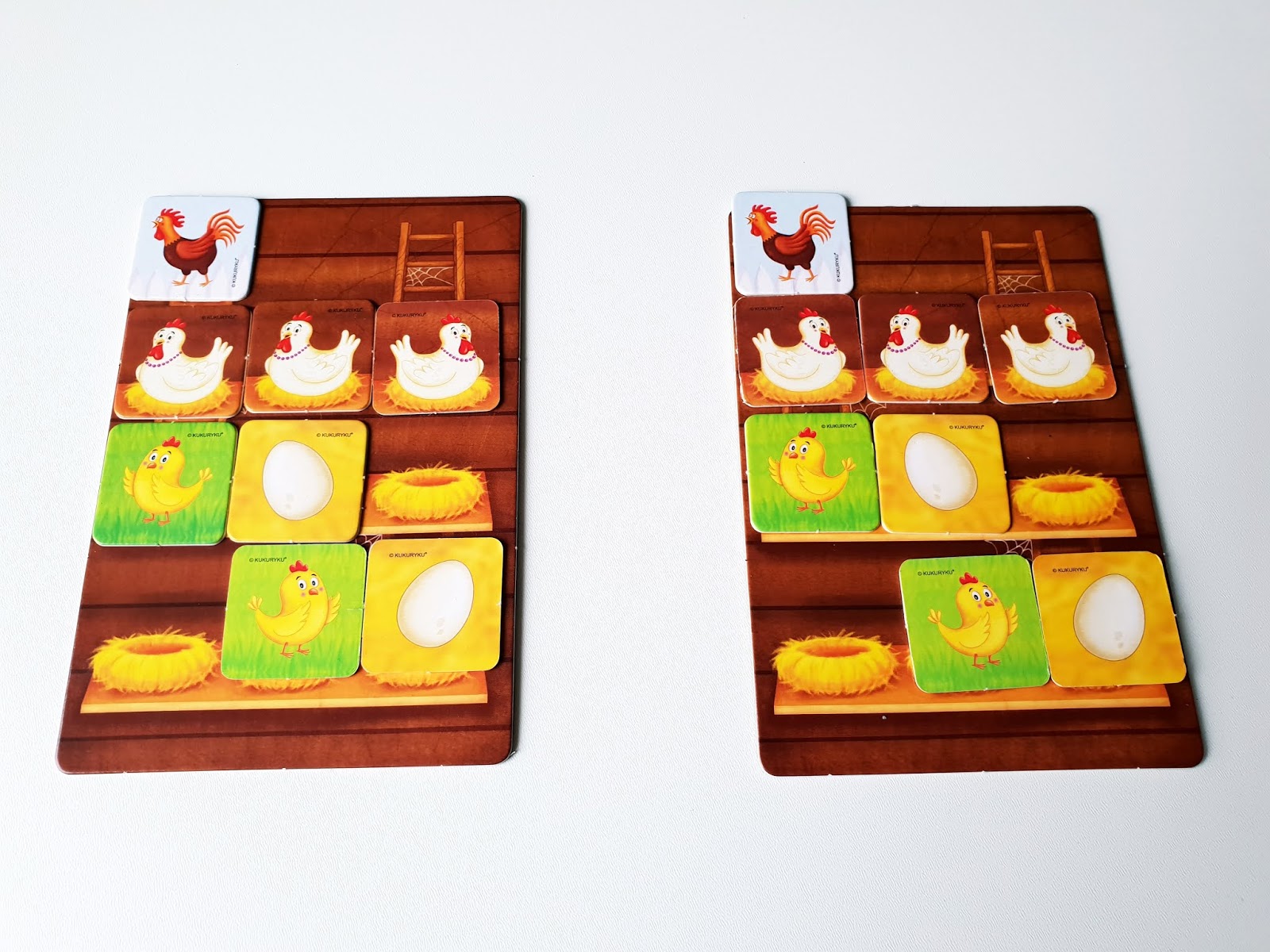 Rozdzielamy między graczy po tyle samo jaj, kurczaków, kur i kogutów (sugeruję po 5 sztuk, z wyjątkiem koguta). Kafelki wrzucamy do woreczków (ja użyłam małych lnianych woreczków z innej gry). Na zmianę gracze losują ze swojej puli po jednym kafelku i wykładają na stół. Ten kto ma silniejszy kafelek, zabiera oba. Jeśli wyłożycie dwa takie same to rozpoczyna się wojna. Gdy skończą się kafelki w woreczku, wrzucamy tam te zdobyte w czasie gry. Wygrywa gracz, który zbierze wszystkie kafelki.