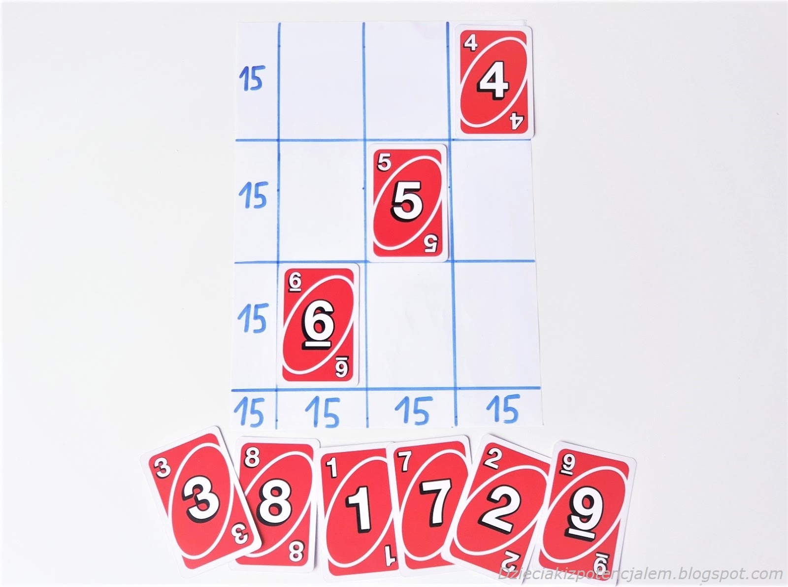 Ostatnia zabawa to kwadrat magiczny (pisałam już o nim wcześniej Ułóż 15 ). Zadanie polega na ułożeniu kart o wartościach 1-9 w taki sposób aby suma w każdym rzędzie i kolumnie, w pionie, poziomie i ukosie, wynosiła 15.