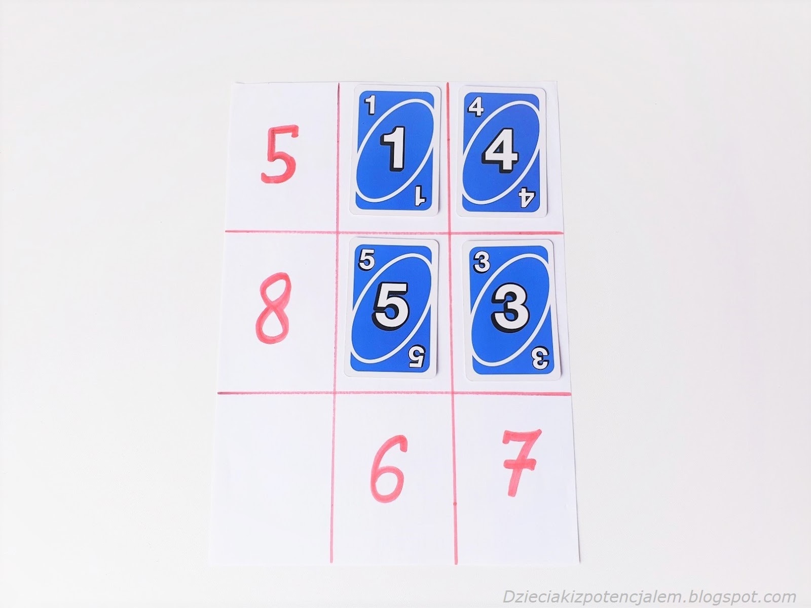 Jeśli mamy maluszka, który liczy tylko do 10 to na całej kartce A4 rysujemy tabelkę 3×3 i wybieramy karty o wartościach 1-5 tak aby do zsumowania były po dwie mniejsze wartości. Dla starszych dzieci odpowiednia będzie tabela 4×4.