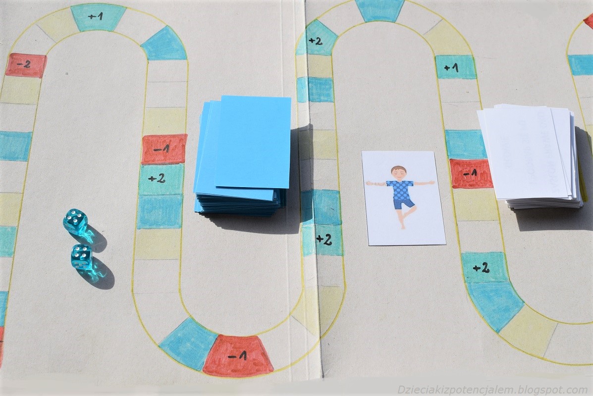 Ale wracając do naszych Pytań i zadań. Gra to zwykły wyścig z polami specjalnymi, które powodują przesunięcie się pionkiem o kilka pól w przód lub w tył (jeśli chcecie więcej urozmaicenia to dodajcie „drabiny”). Najważniejszą jednak częścią gry są kolorowe pola, po najechaniu których losujemy kartę z pytaniem lub zadaniem.