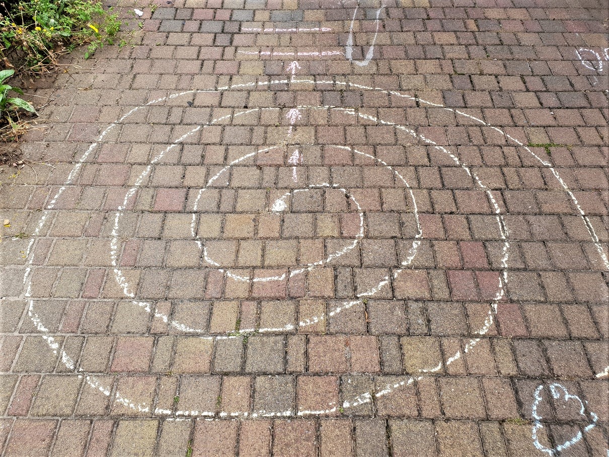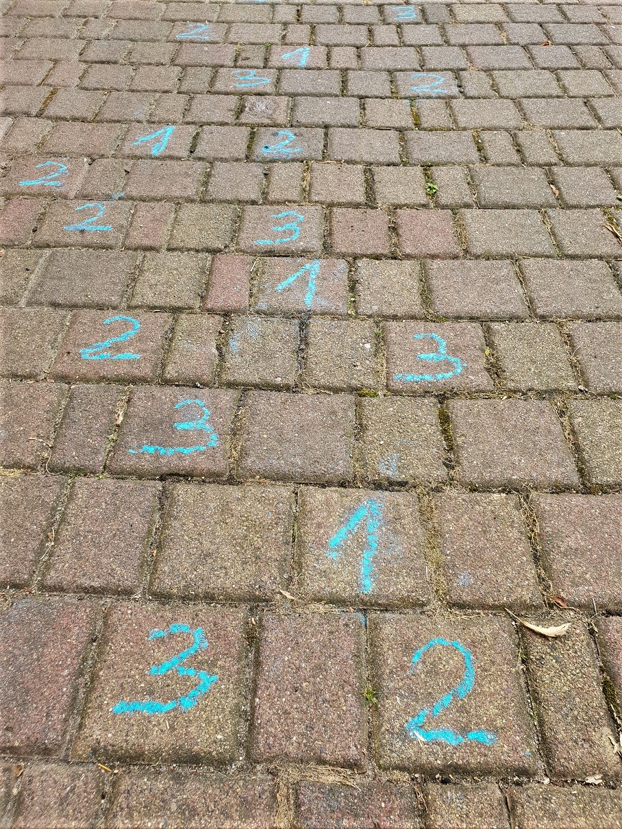 Kredą narysowaliśmy na ziemi „ścieżkę”, którą trzeba przejść jak najszybciej, wykonując różne zadania ruchowe i matematyczne.