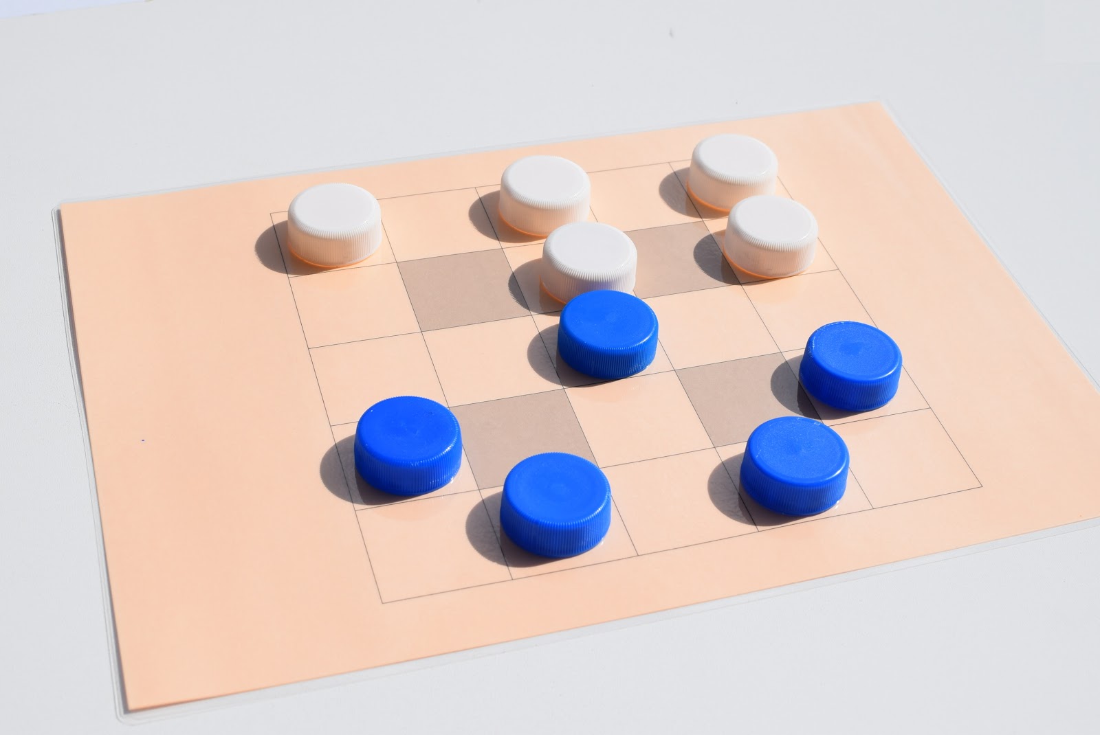 Gracze mają do dyspozycji po pięć pionków w swoich kolorach. Ustawiają je na planszy w rzędzie po swojej stronie planszy.