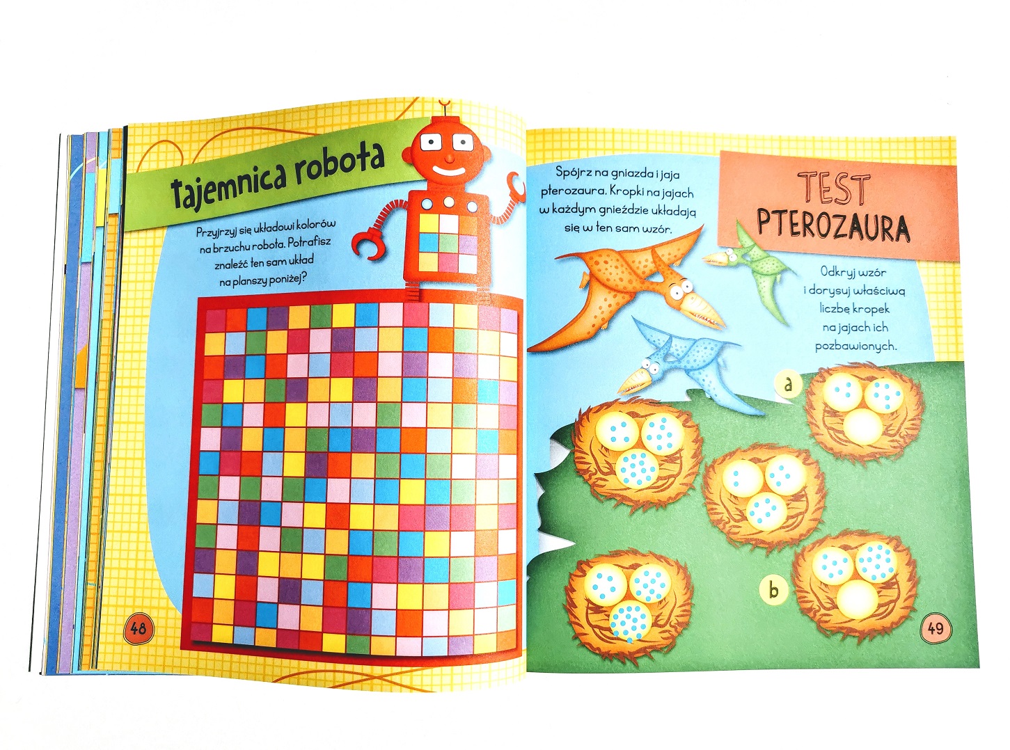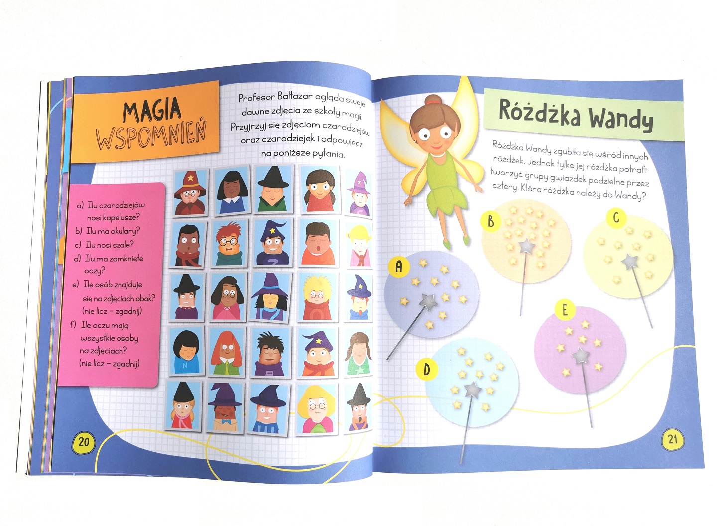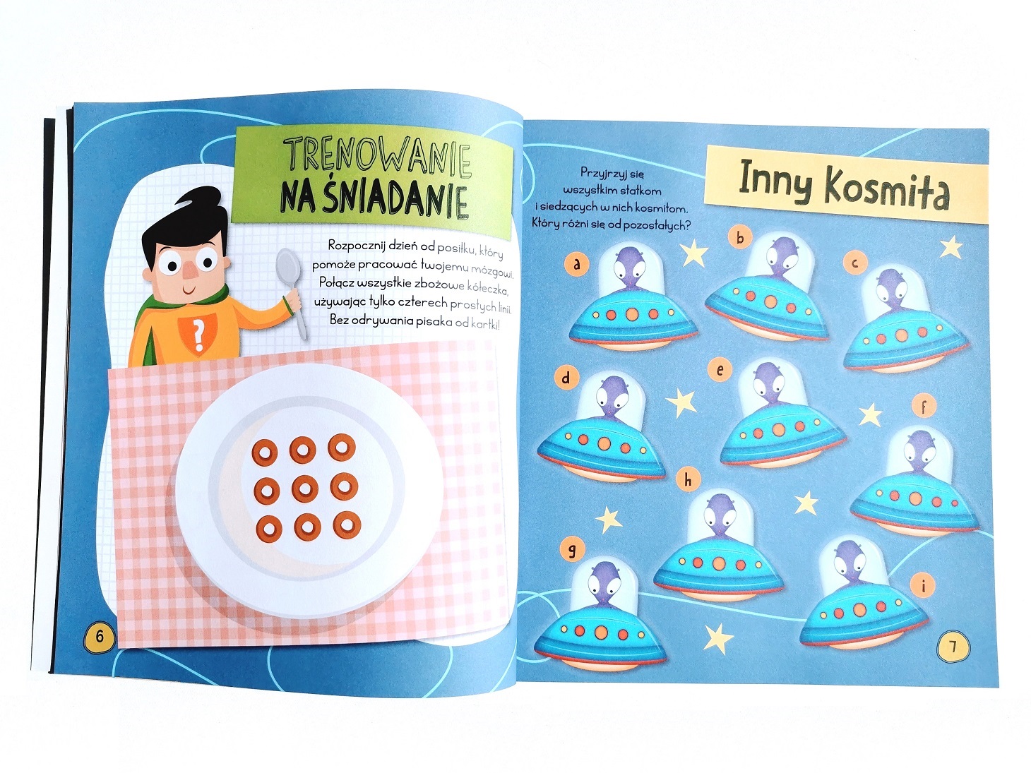 Ze względu na zdecydowaną przewagę zadań na spostrzegawczość, tą część z serii Bystry Umysł możemy zaproponować trochę młodszym dzieciom. Tu myślę, że dzieci 7-letnie powinny sobie poradzić. Zadania są różnorodne więc znajdą się i takie, przy których rodzic będzie musiał pomóc czy naprowadzić na rozwiązanie. Jednak niezależnie od poziomu trudności, zawsze dobrze gdy poświęcimy chwilę i włączymy się w zabawę z dzieckiem 😉