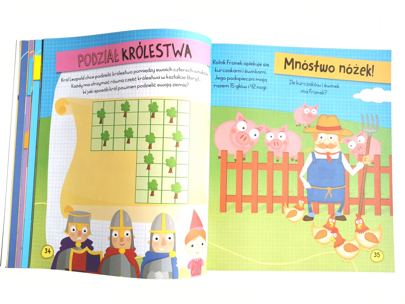 W książce znajdziemy przede wszystkim zadania na spostrzegawczość typu znajdź różnice, co pasuje, co będzie następne, zadania rozwijające logiczne myślenie i trochę zadań z treścią ćwiczących podstawowe działania czyli dodawanie, odejmowanie, mnożenie i dzielenie.
