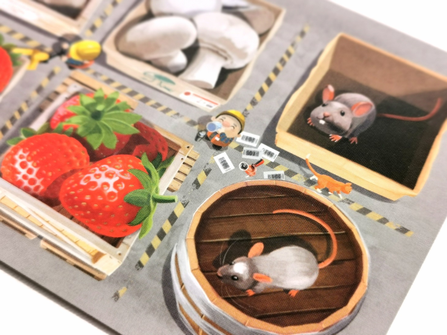gra planszowa magazynier, zdjęcie przedstawia zbliżenie karty do gry, na którym widać dwie skrzynki z myszami, skrzynkę z truskawkami i kawałek skrzynki z pieczarkami, ilustracje są bardzo realistyczne i mają żywe kolory