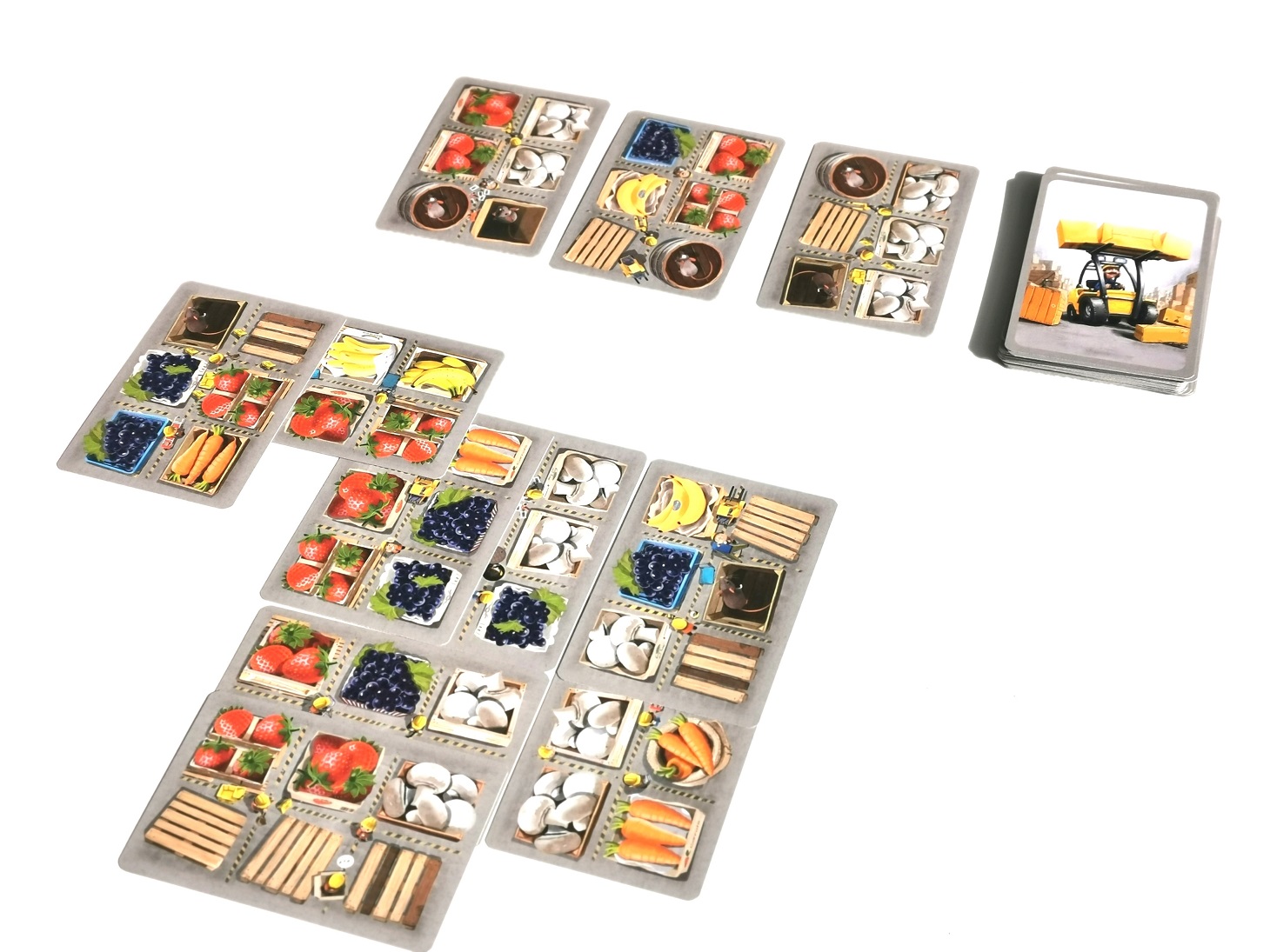 gra planszowa magazynier, na zdjęciu układ ośmiu kart jednego z graczy, powyżej trzy odkryte karty leżące na rampie rozładunkowej oraz stos zakrytych kart