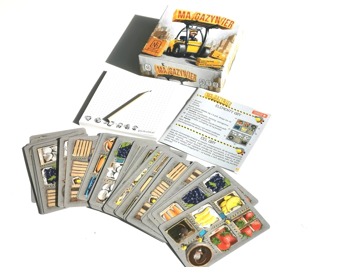 gra planszowa magazynier, na zdjęciu widać pudełko gry Magazynier, notesik do zapisywania punktów wraz z ołówkiem, instrukcję oraz karty do gry rozłożone w kształt wachlarza