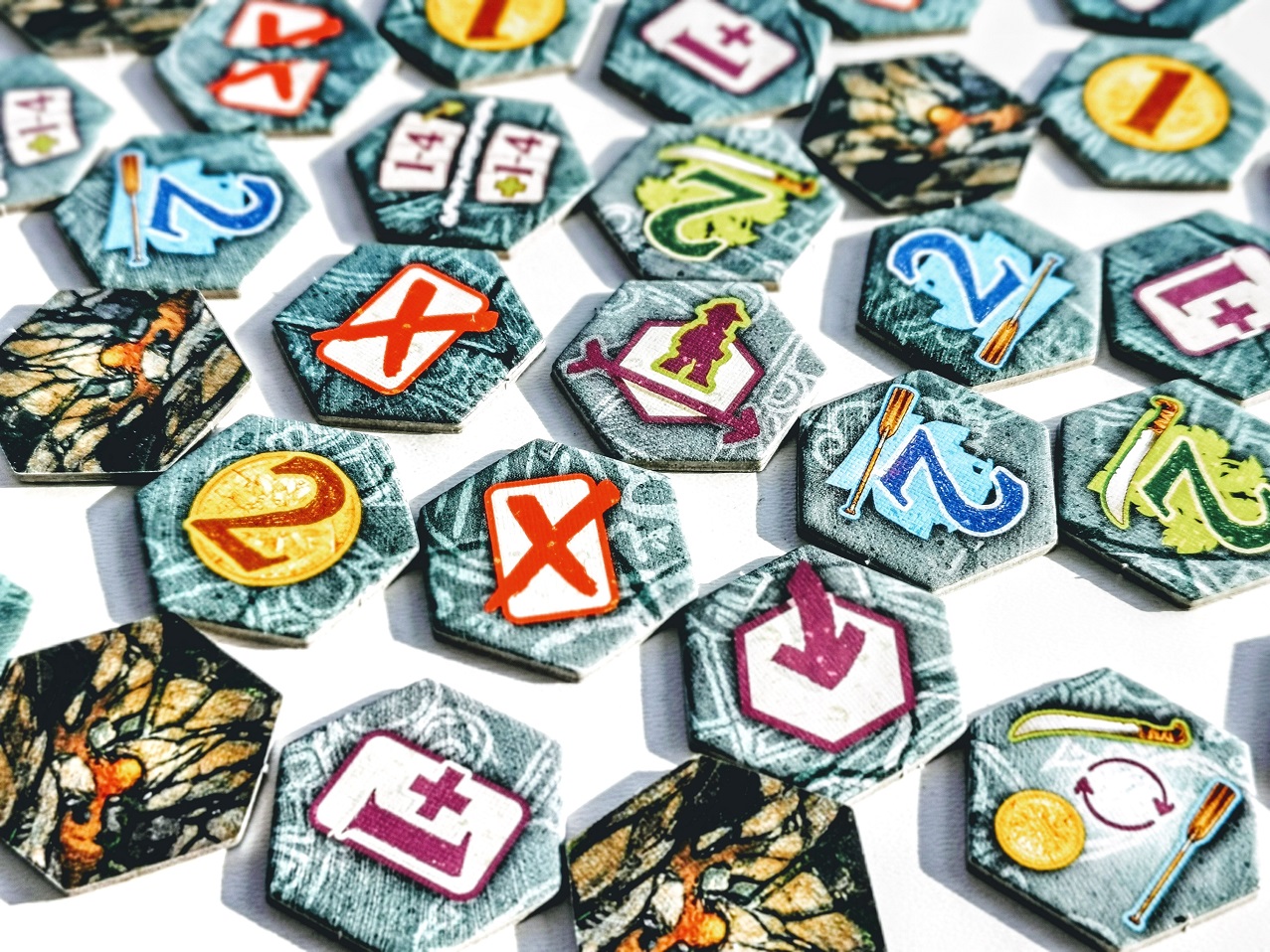Dodatkowo w pudełku znajdziemy: blokady, które rozstrzygają ewentualny remis, płytki ekspedycji dla każdego z graczy, płytkę rynku, znacznik gracza rozpoczynającego, osiem pionków oraz żetony jaskiń.