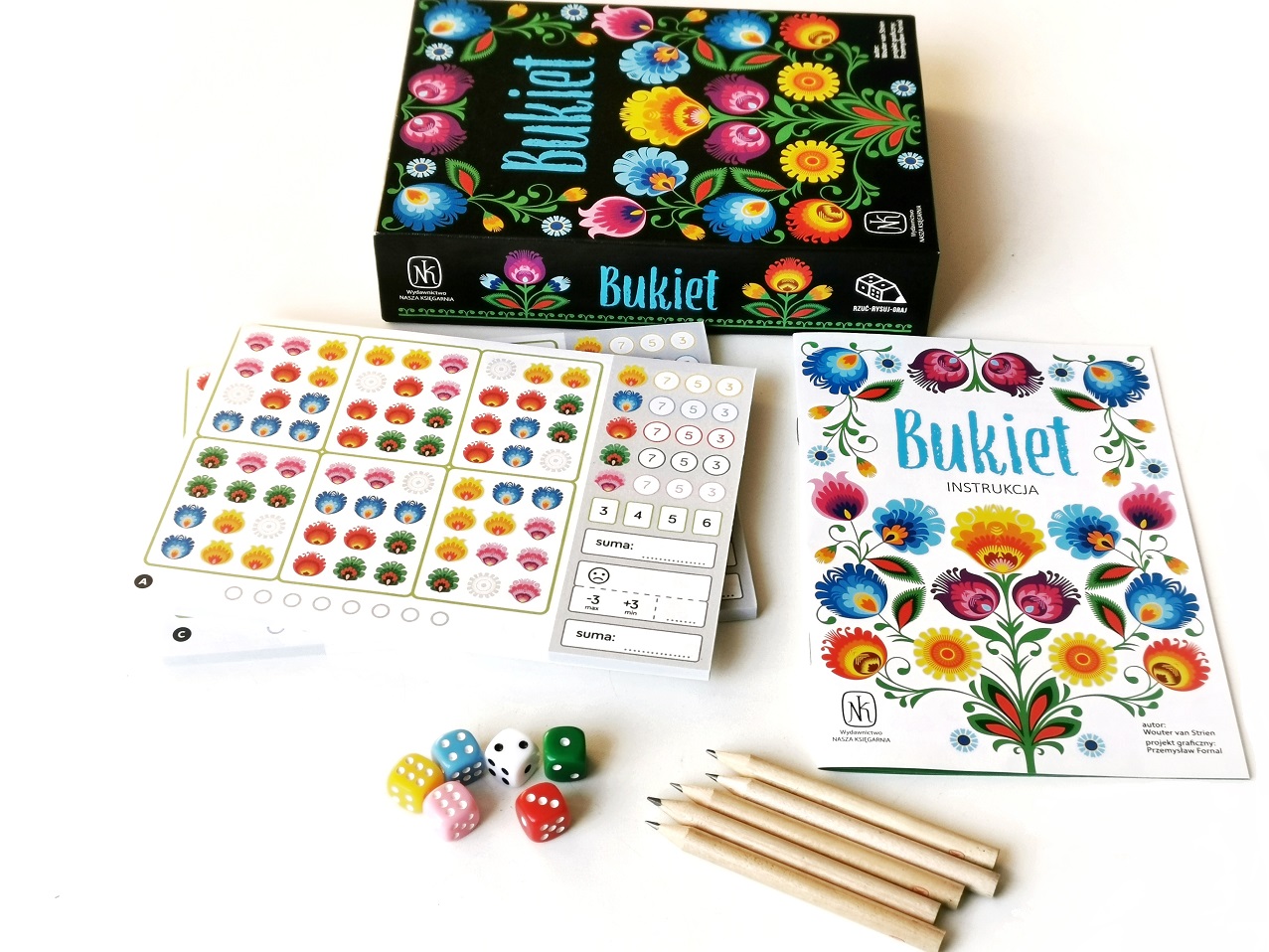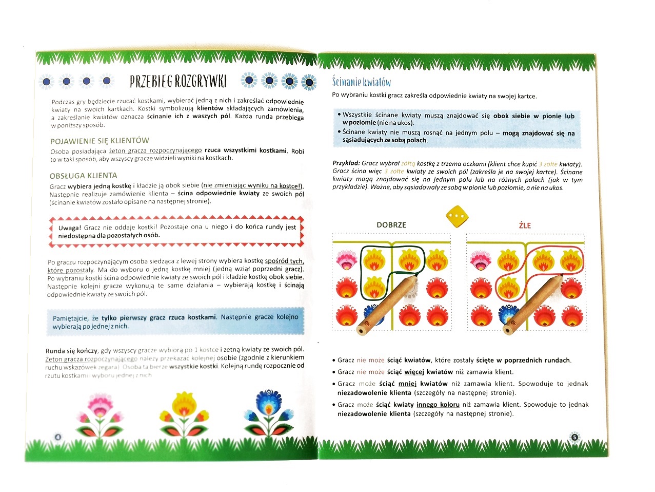 Bukiet od Nasza Księgarnia jest jedną z tych gier. Mały, kompaktowy, odpowiedni do grania w parze, w pięć osób, a jak ktoś lubi pobijać swoje wyniki, jest i wariant solo. Gra jest pięknie wydana, pudełko przyciąga uwagę łowickimi kwietnymi grafikami, które znajdziemy też na kartach do gry.