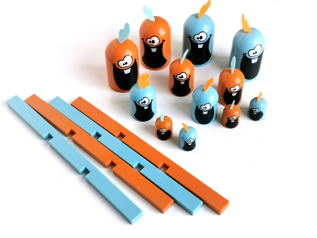 W pudełku znajdziemy cztery plastikowe deseczki, z których budujemy naszą planszę oraz dwanaście pionków różnej wielkości, w dwóch kolorach. Pionki są ładne, duże i niewątpliwie stanowią ogromy atut całej gry.