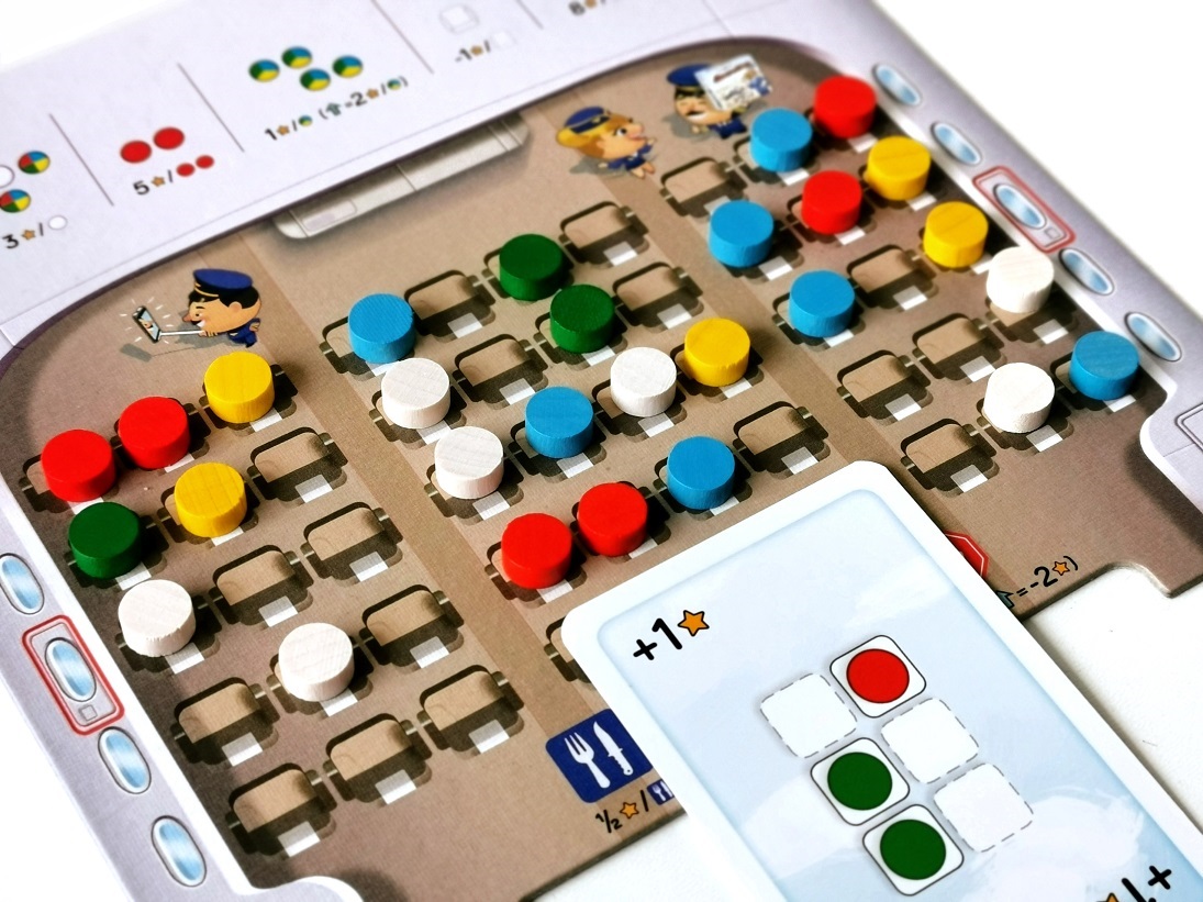 Kolejną akcją, jaką wykonujemy w swojej turze jest ułożenie na naszej planszetce znaczników odpowiadających tym wskazanym na dobranej karcie. Musimy jednak pamiętać o ułożeniu zgodnym ze wskazówkami na karcie oraz z zasadami rozmieszczania pasażerów.