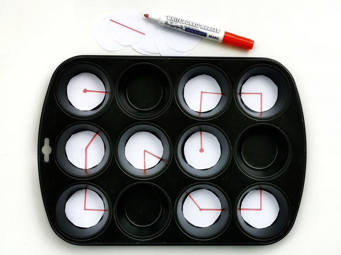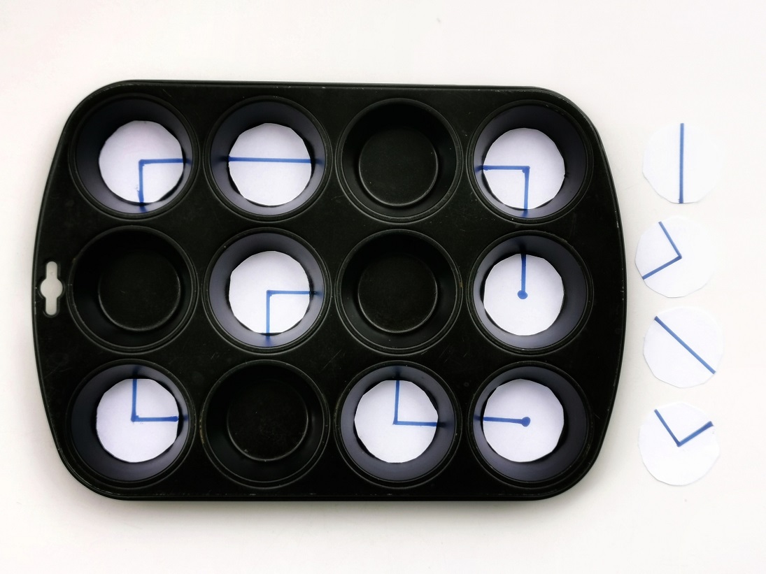 Sama zabawa powstała w kilka minut. Potrzebujemy do niej kartki, czegoś do pisania i… foremki do babeczek 😉 Ta ostatnia to urozmaicenie bez którego oczywiście też można się obyć. Zamiast niej proponuję narysować na kartce A4 12 kół, po cztery w trzech rzędach, tak aby odwzorowały układ z foremki.