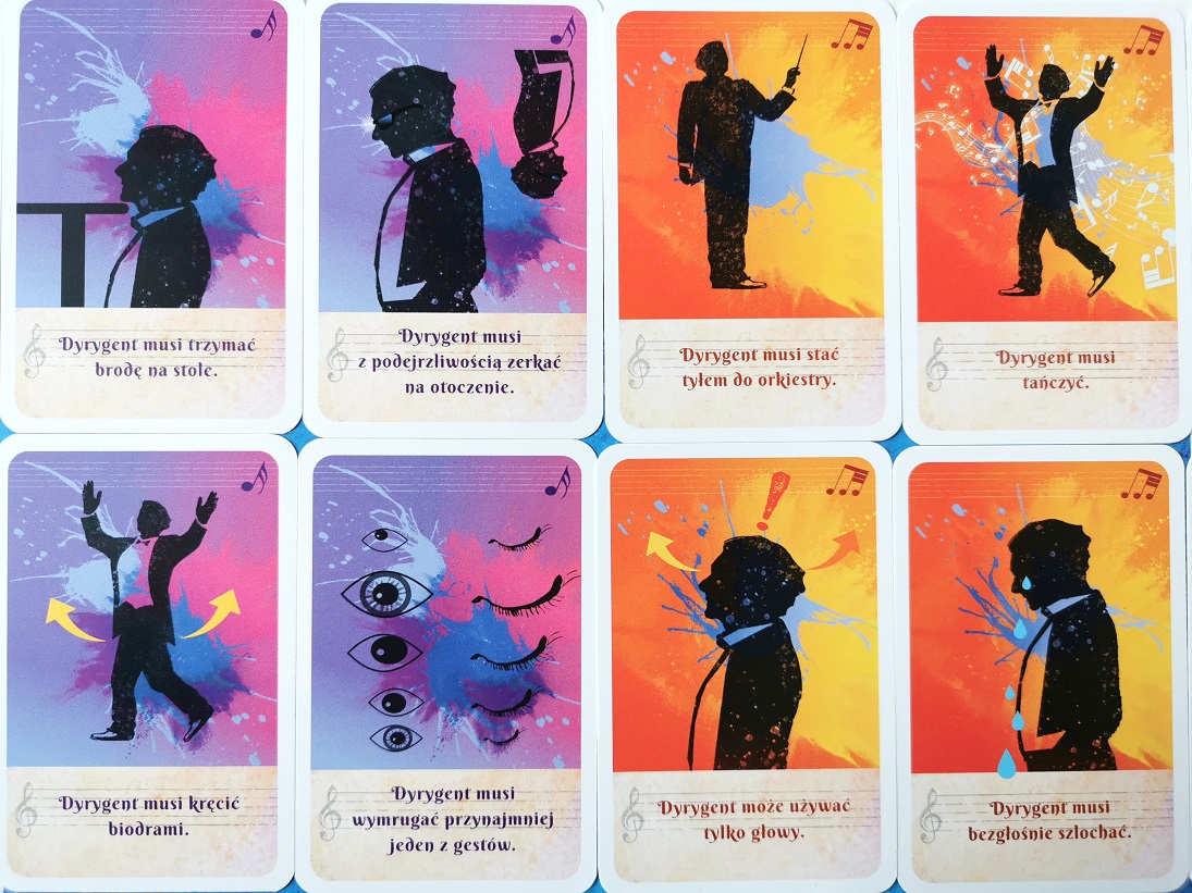 Dyrygent losuje dwie karty z taktami, które będzie musiał zaprezentować pozostałym graczom. Znajdują się tam wybrane z czterech instrumentów i mają różne cechy: mogą być duże, małe, z samymi konturami lub pełne. One pełnią funkcję nut a do każdego z tych instrumentów przypisany jest, ustalony wcześniej przez graczy gest. I to właśnie do dyrygenta należy jak najdokładniejsze wykonanie serii tych gestów tak aby pozostali gracze rozpoznali w nich konkretne instrumenty i odwzorowali utwór wykorzystując swoje karty.