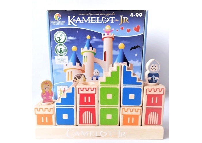 Kamelot Junior to jedna z naszych ulubionych gier. Należy do serii Smart Games czyli fantastycznych łamigłówek logicznych, które służą zarówno najmłodszym jak i starszym graczom. W pudełku znajdziemy drewniane elementy, które posłużą do konstrukcji zamku i książeczkę z zadaniami o różnym stopniu trudności. Zadaniem dziecka jest wybudowanie zamku z użyciem wskazanych elementów w taki sposób aby przeprowadzić księcia znajdującego się w jednej jego części, do księżniczki czekającej na odległej wieży.