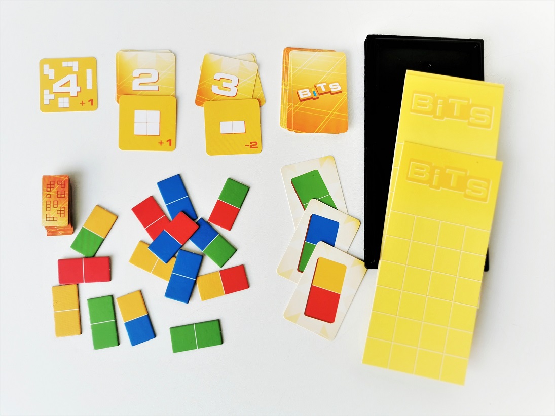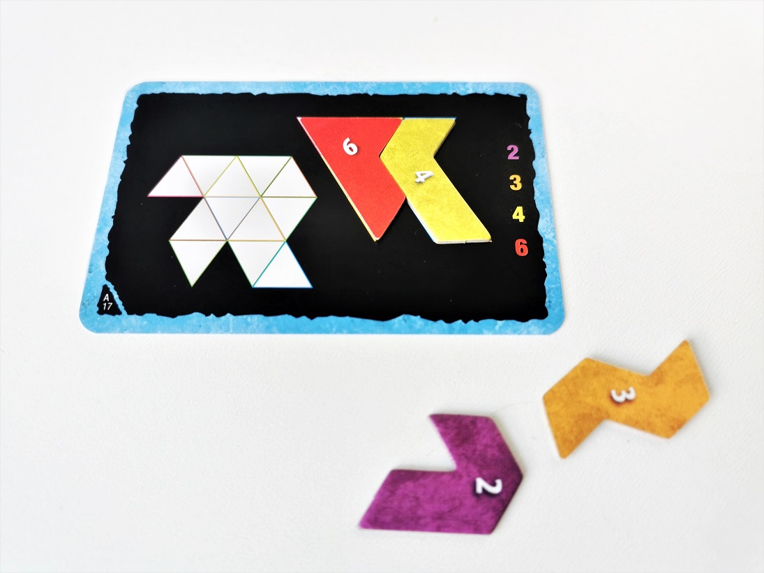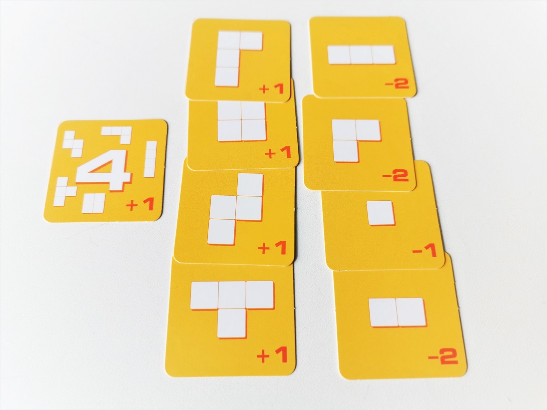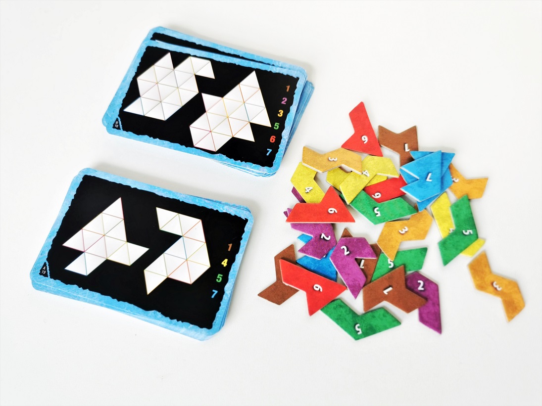 Tutaj do dyspozycji mamy 32 dwustronne karty z łamigłówkami, z łatwiejszym poziomem z jednej strony i trudniejszym z drugiej oraz cztery zestawy kolorowych kafelków w rozmaitych kształtach (po 7 kafelków w każdym zestawie).