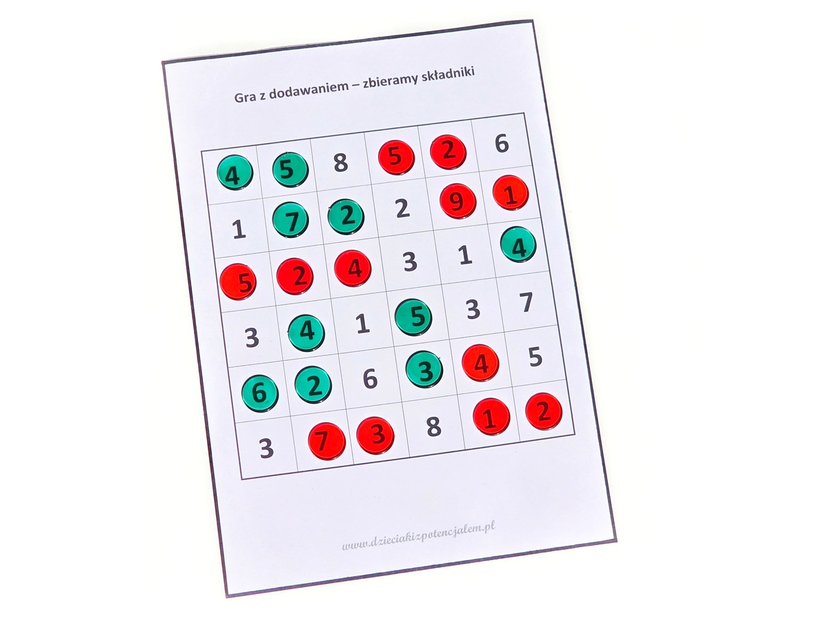 Następnie zaznacza na planszy składniki, których suma da wylosowaną wcześniej liczbę.