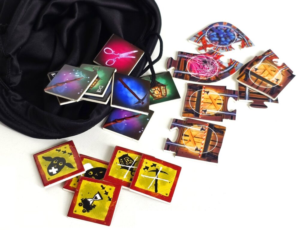 Gra mieści się w dość sporym pudełku, które skrywa naprawdę pokaźną liczbę kolorowych, estetycznie wykonanych elementów. Od razu zwróciliśmy uwagę na kafelki — są grube, solidne i lekko błyszczące, co robi świetne wrażenie. Biorąc pod uwagę dynamikę gry, delikatne elementy mogłyby się szybko popsuć podczas chaotycznych prób łączenia ich ze sobą. Te które dostajemy z grą wyglądają na niezniszczalne 😉