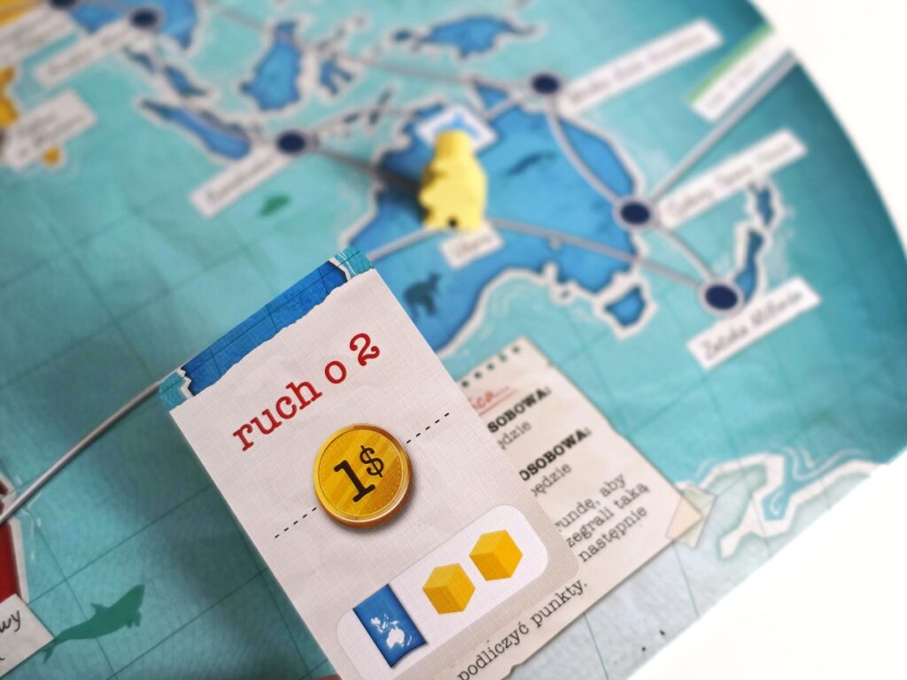 - Ruch, który pozwala przesunąć naszego wędrownika po mapie o wskazaną liczbę pól. Możemy też za drobną opłatą przemieścić się między lotniskami lub odrzucić żeton częstego pasażera, żeby lecieć za darmo;